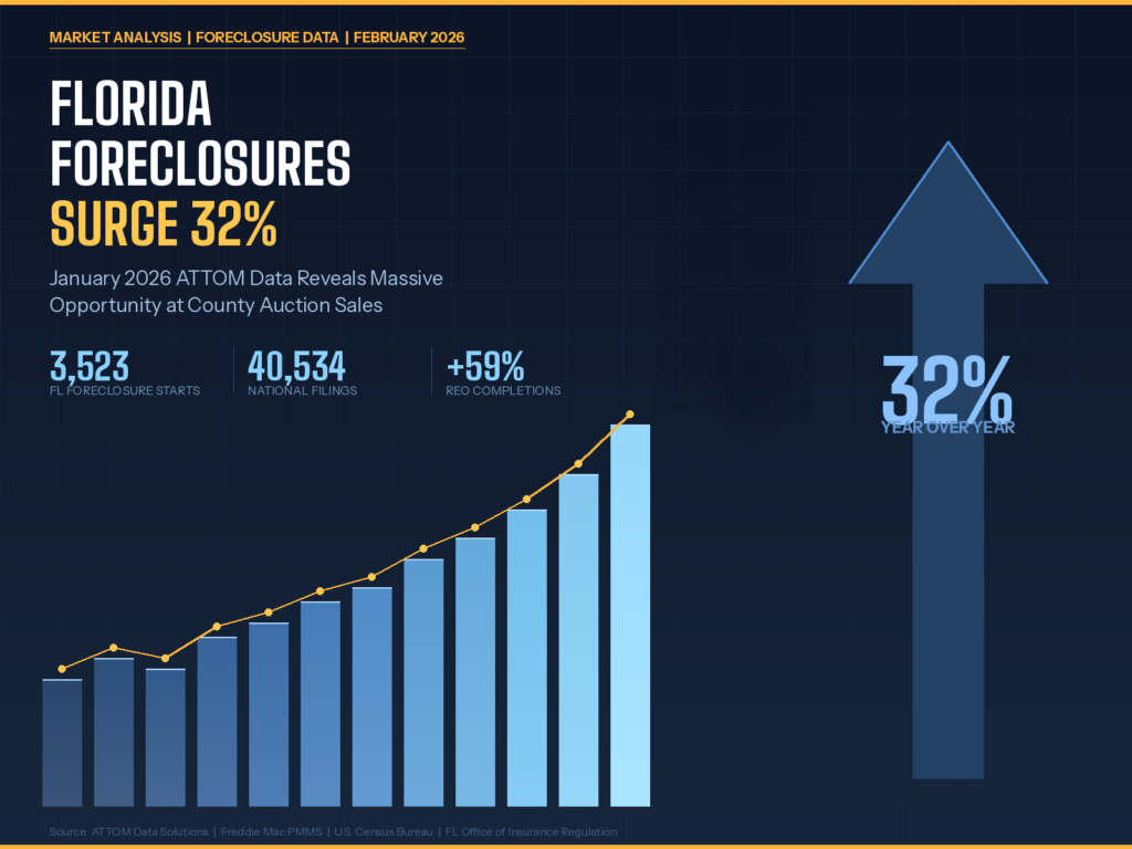 The latest foreclosure data is in, and for Florida real estate investors, the numbers tell a story that should have you moving quickly. ATTOM’s January 2026 U.S. Foreclosure Market Report, released on February 11, 2026, reveals that foreclosure activity across the nation rose year over year for the eleventh consecutive month. Nationally, 40,534 properties received a foreclosure filing in January, representing a 32 percent increase from the same period last year. Foreclosure starts climbed 26 percent year over year, and completed foreclosures jumped a staggering 59 percent. For investors who specialize in county foreclosure auctions, this is not just a trend to watch. It is a signal to act.